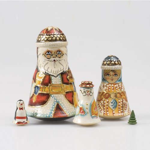 PThis dedoushka a nesting doll which represents an old man 5-piece set is a rendition of Santa Claus and his Christmas household The wood doll figures have a bell shape body style and with the incredibly detailed hand paintings the well crafted set is sure to bring some holiday spirit into an Read More..